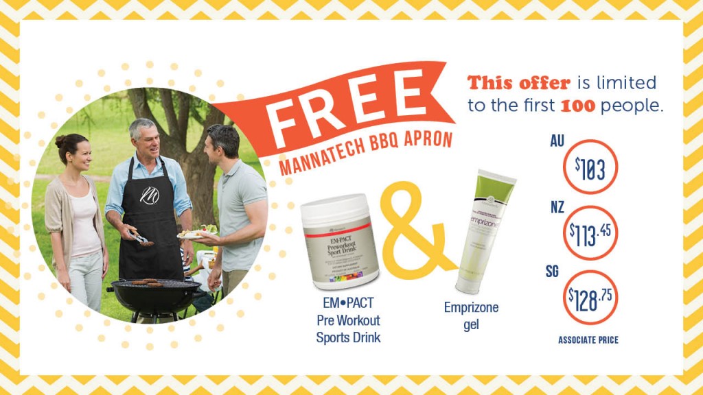 During BP13 through to BP1 we’ve bundled one 360g tub of EM.PACT pre-workout sports drink, one 142g tube of Emprizone gel and a free barbeque apron into a special Summer Survival promotion.